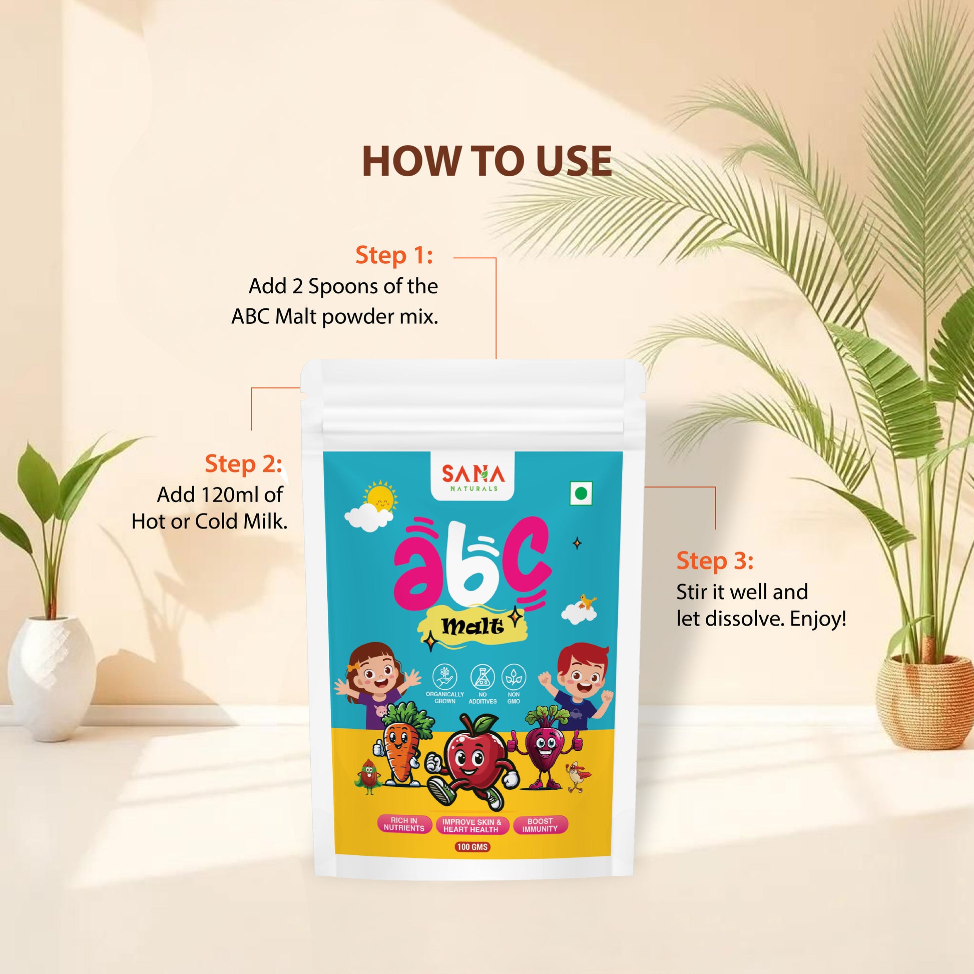 Add 2 teaspoons of ABC Malt to 120 ml of warm or cold milk.